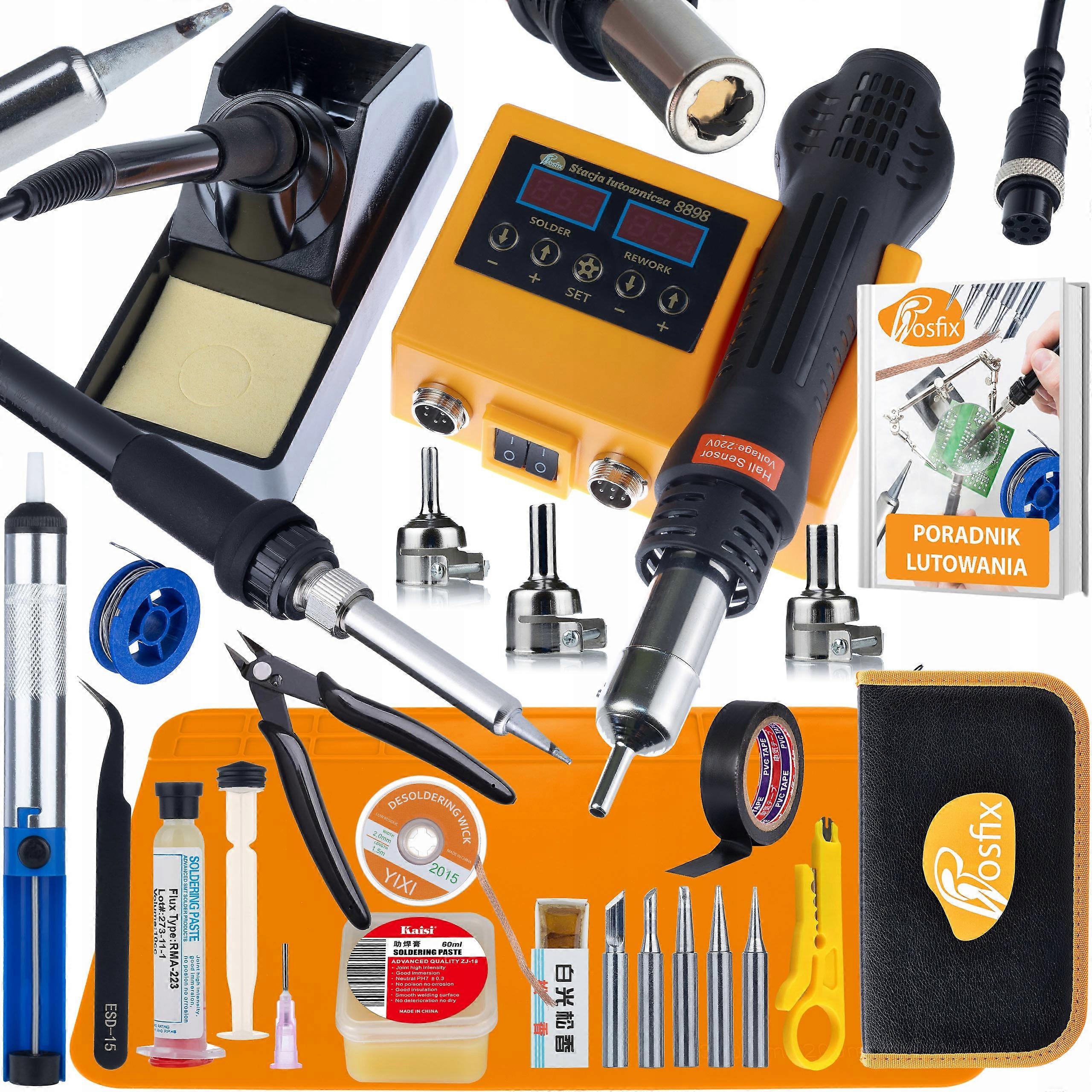Rosfix Orange Husky 2w1 ProKit to wszechstronna stacja lutownicza, która łączy funkcje HOT AIR oraz grotową, idealna zarówno dla amatorów, jak i profesjonalistów. Dzięki mocy 660W urządzenie nagrzewa się błyskawicznie, a precyzyjna regulacja temperatury w zakresie 100–480°C zapewnia komfort i bezpieczeństwo pracy. Zestaw zawiera 16 elementów, w tym cenną cynę, pęsety oraz odsysacz, co czyni go kompletnym rozwiązaniem do naprawy elektroniki i projektów DIY. Wysokiej jakości materiały oraz trwała konstrukcja stacji gwarantują długotrwałe użytkowanie. Dwa niezależne wyświetlacze LCD umożliwiają łatwe monitorowanie temperatury, co jest kluczowe podczas precyzyjnych prac serwisowych. Dodatkowo, w zestawie znajduje się praktyczne etui, które ułatwia transport i przechowywanie akcesoriów. Rosfix Orange Husky to doskonały wybór dla każdego, kto ceni sobie jakość, funkcjonalność i wygodę w lutowaniu.