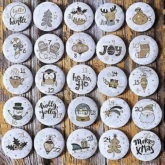 Description: Specification: Weight: about 80g (one set) Shape: round Color: different patterns Material: aluminum alloy (face) + plastic (bottom) + pin Size: 3.2 cm in diameter Package content: 24/25 Advent calendar digital badges Tip: There are sharp needles, please keep away from children or use under the supervision of adults. Specifications: 1. Using our badge set for making Advent Calendar, you can create your own creativity and make your own personalized calendar. 2. This advent holiday digital set includes 24 different Advent calendar buttons, the number is from 1 to 24, and there are pins every day, so that Santas wait time is not too long. 3. Using the bow stitches installed on the back, the sticker can be easily attached to the fabric (such as a small jute bag/bag). 4. Since the needle can rotate in one direction, the needle can be easily aligned. Therefore, if there is no alignment, there is no need to disassemble and reinsert. Package Included: 24*brooch