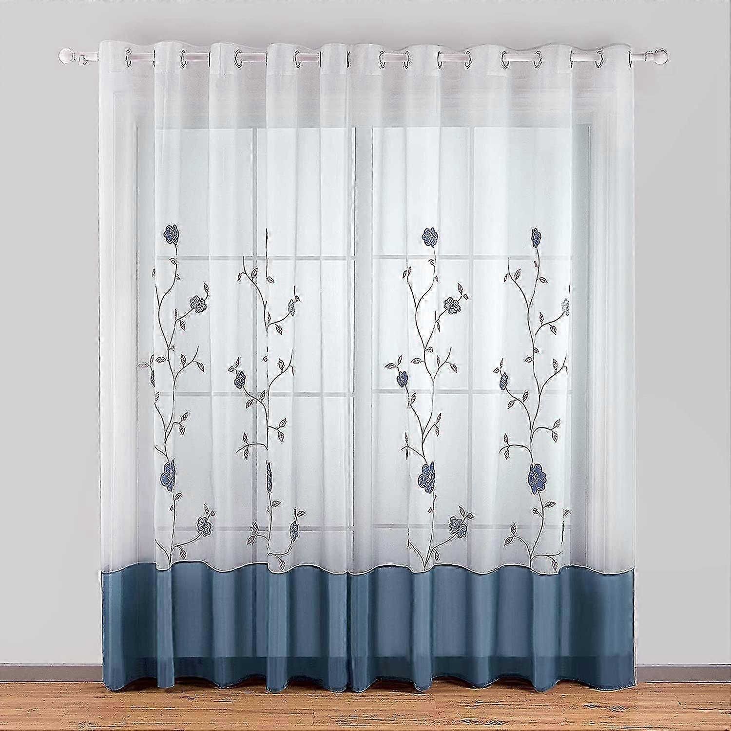 1 Piece Floral Embroidery Sheer Eyelet Curtains for Bedroom Kitchen Living Room, 140cmx175cm, Blue