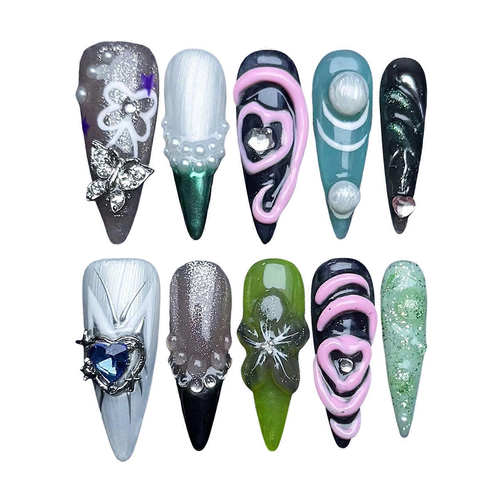 Features: French Style Press On Nails: This set includes 10pcs elegant French style press on nails with a classic white tip design, perfect for a chic and timeless manicure look. Easy to apply and reusable, ideal for DIY at-home manicures or salon use. Full Cover Artificial Nails: 10pcs women full cover artificial nails provide a natural and comfortable fit, designed to enhance your nail length and shape effortlessly. Great for DIY nail art and quick at-home manicures. 3D Floral Press On Nails: Features 10pcs stunning 3D press on nails with intricate floral designs, adding a touch of elegance and sophistication to your manicure. Perfect for special occasions or everyday wear. Punk Style Butterfly False Nails: Stand out with 10pcs punk style butterfly false nails, featuring bold and edgy designs for a unique fashion statement. Ideal for women and girls who love creative DIY nail art. Rhinestone French Artificial Nails: 10pcs French 3D rhinestone artificial nails offer a glamorous and sparkling finish, perfect for parties or events. Easy to apply and reusable, great for DIY nail design at home or in salons. Specification: Material: Resin Size,Thumb(mm),Index Finger(mm),Middle Finger(mm),The Fourth Finger(mm),Little Finger(mm) XS,14,10,11,10,8 S,15,11,12,11,9 M,16,12,13,12,10 L,17,13,14,13,11 Notes: 1. The real color of the item may be slightly different from the pictures shown on website caused by many factors such as brightness of your monitor and light brightness. 2. Please allow slight manual measurement deviation for the data. Include: 10pcs x Women Artificial Nail Art Kit 1 Set x Jelly Glue 1 x Nail File
