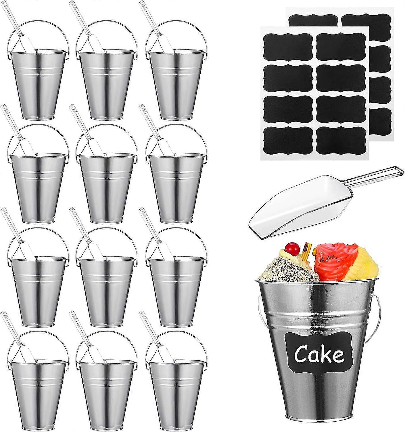 12 Pcs Galvanized Bucket With 12 Pcs Clear Plastic Ice Scoop 20.3 Oz Metal Beer Bucket With Handle Metal Pail Mini Toy Container 16 Pcs Blackboard Sti