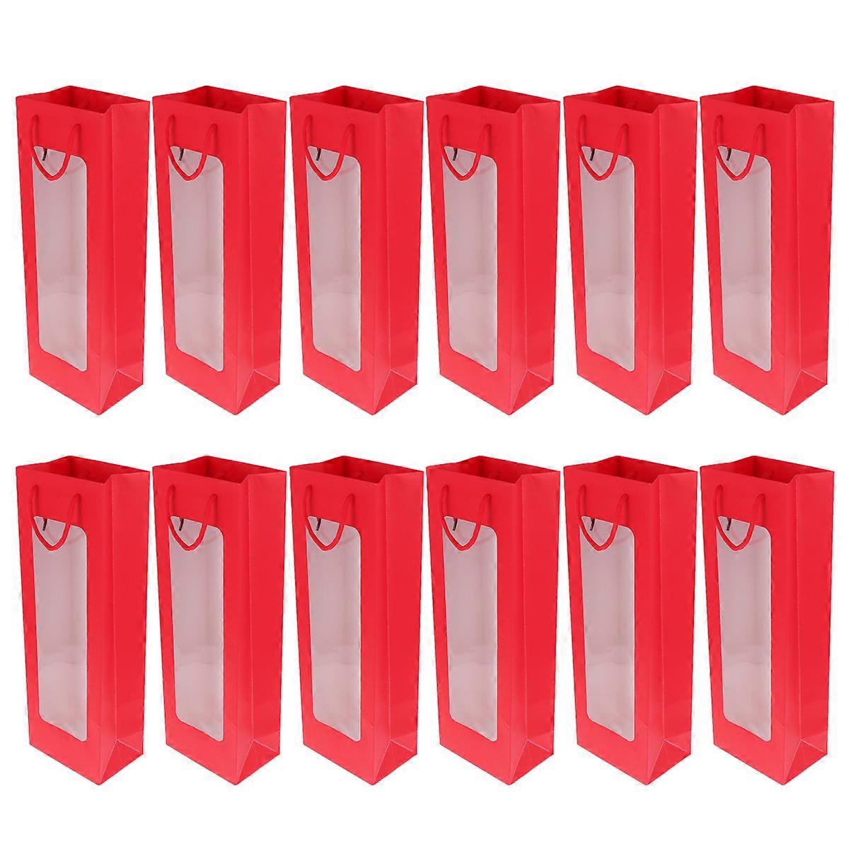 12pcs Single Red Wine Bag Gift Bag Kraft Paper Wine Tote Bag Portable Packging Bag Transparent Window Wine Carrier Bags (Red)