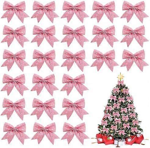 24 PCS Small Pink Christmas Bows, Decorative Glitter Christmas Tree Bows Wreaths Xmas for Tree Ornaments, Sequin Bow Ties Bowknot for Garland,Party,Gi