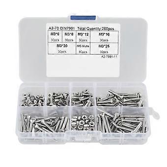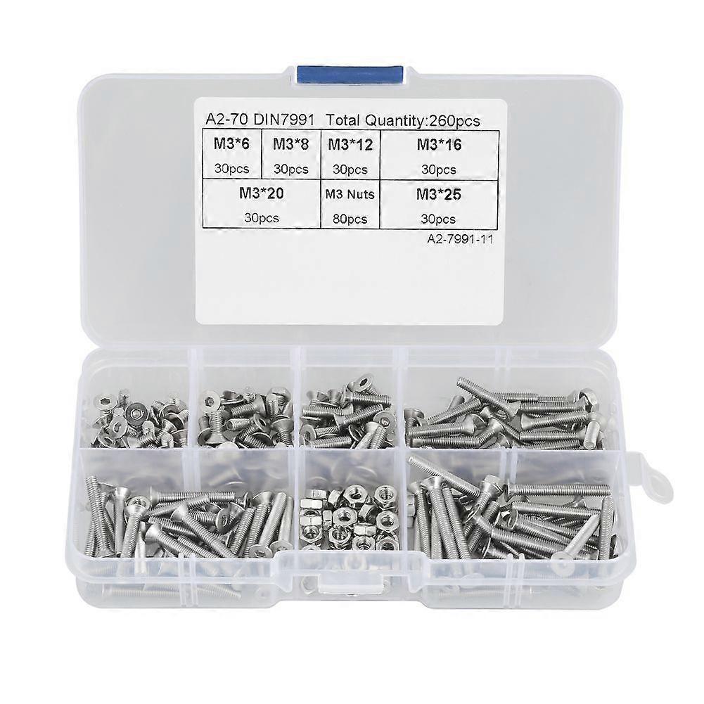 260pcs M3 304 Stainless Steel Hex Socket Flat Head Screw Bolts Nuts Kit With Box