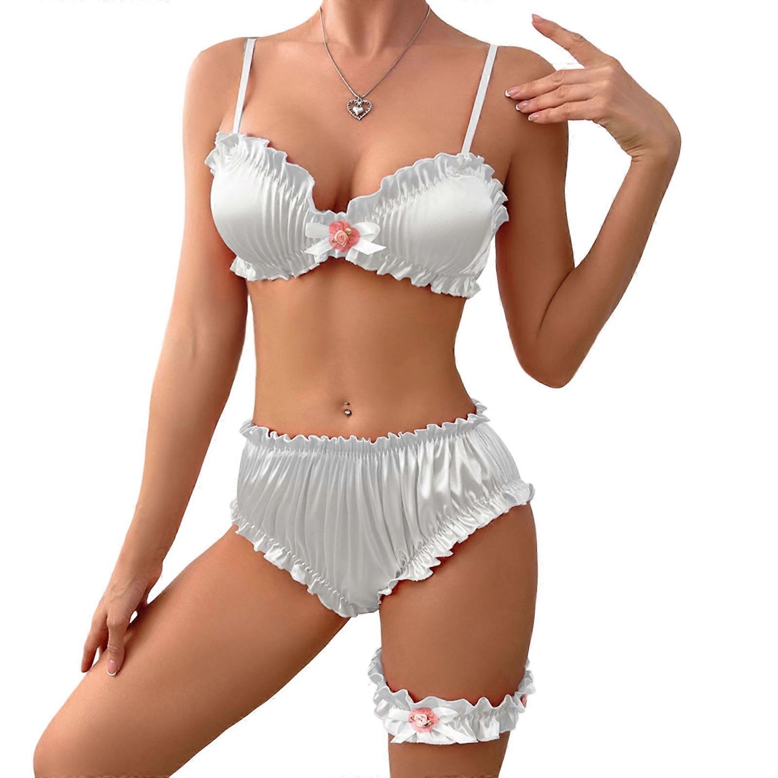 3Pcs Garter Lingerie Set Matching Bra and Panty Thigh Band 3Pieces Boudoir Outfits for Women Sleepwear Nightwear White XL