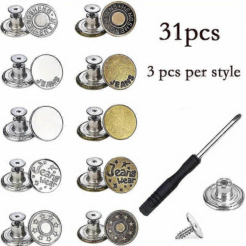 30pcs Button For Sewing Metal Jeans, 17mm No-Sew Nailess Removable Metal Jeans Buttons Replacement Repair Combo Thread Rivets And Screwdrivers