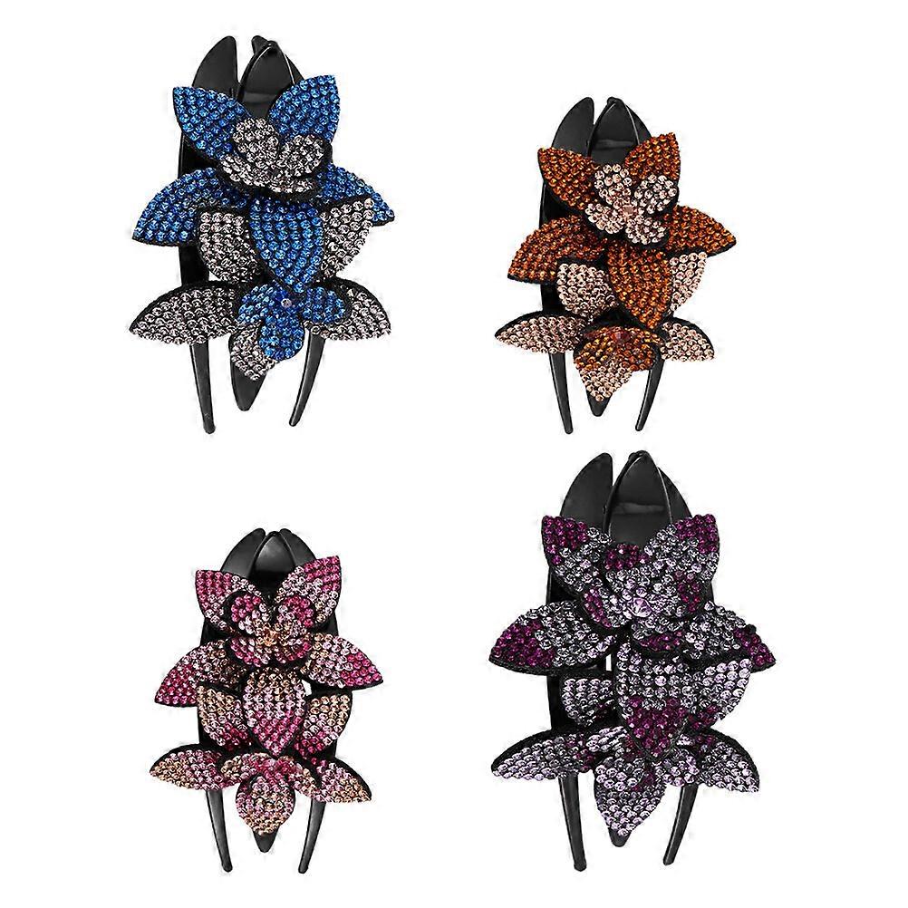 4Pcs Rhinestone Double Flower Floral Hair Clips Nonslip Comb Hairpins for Women