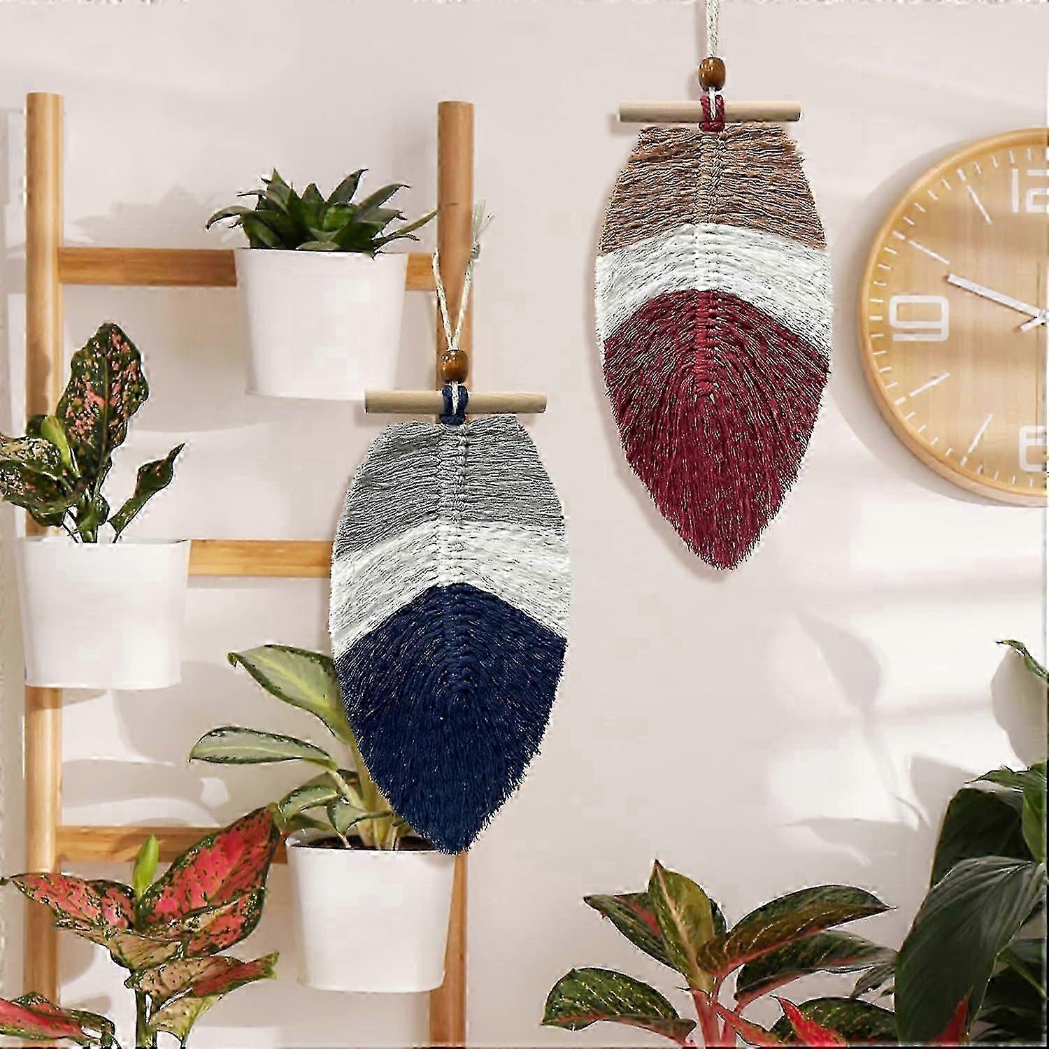 Boho Leaf Wall Decor,2 Pieces Macrame Wall Hanging Feather Leaf, Woven Cotton Wall Boho Decorations Ornaments with Wooden Bead, Small Bohemian Wall Pe
