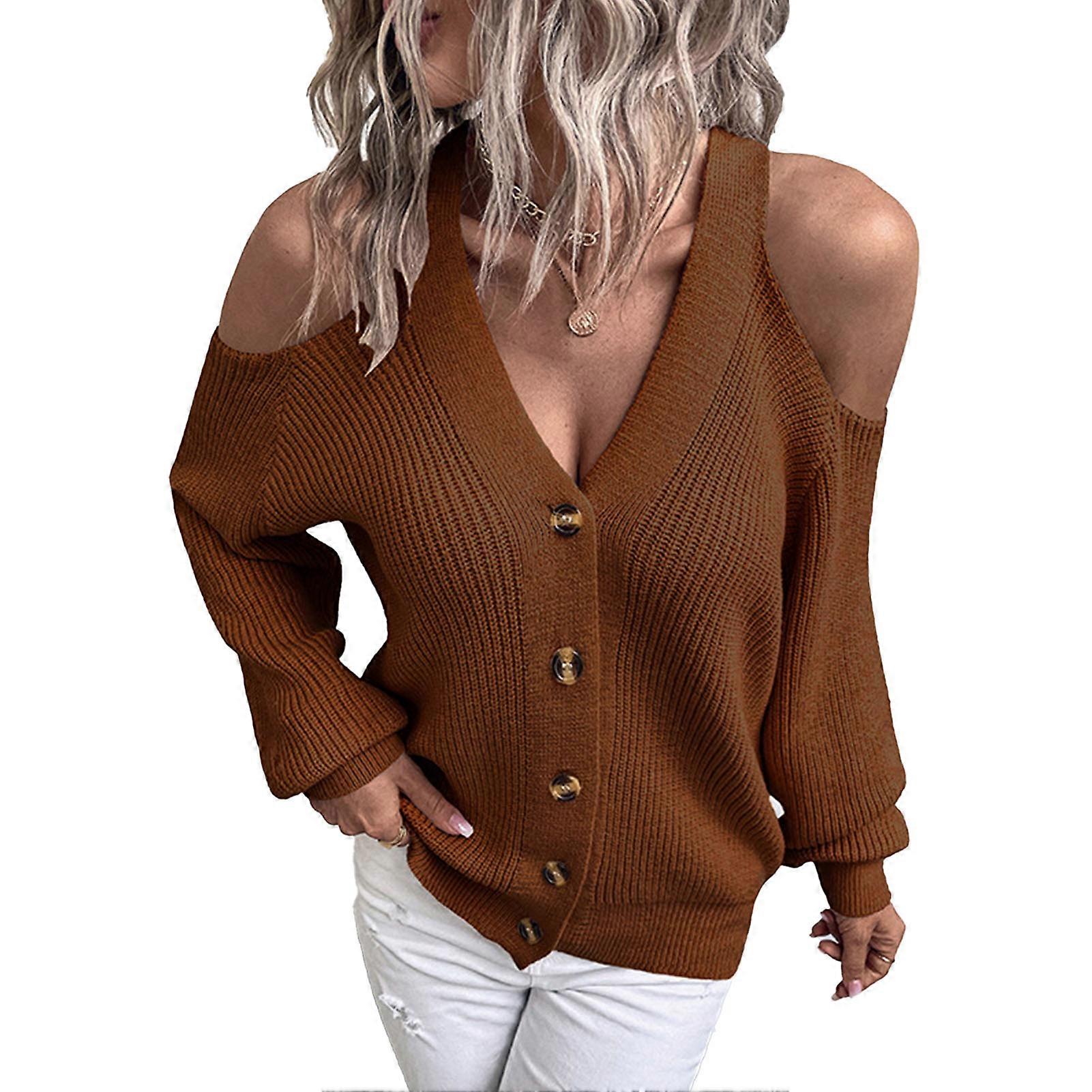 Button Up V Neck Cold Shoulder Pure Color Breathable Women Long Sleeve Sweater for Daily Party Work