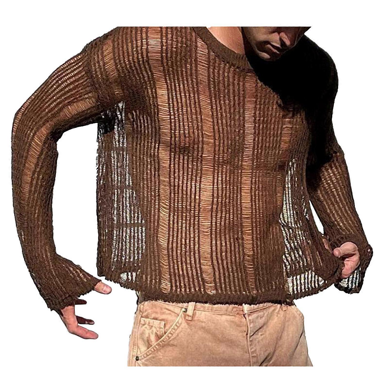 Men Long Sleeve T Pure Color Stylish Charming Weaving Mesh Hollow Fashionable Male Shirt for Party