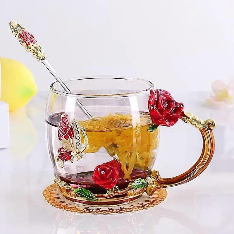 Exquisite 3D Coffee Tea Glass Enamel Cups Butterfly Rose Tea Cup Carved Flower Cup