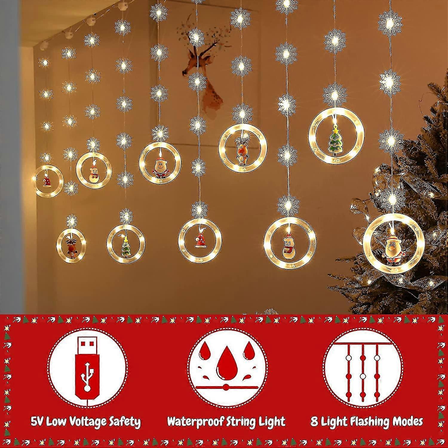 LONG DESCRIPTION:Creative Christmas Window Lights: We get inspiration from Christmas and combine them with curtain lights. The Christmas window lights are equipped with 50 snowflake pendants and 10 Christmas-themed small toy pendants, with warm white LED lights to create a warm and romantic Christmas atmosphere for you. You can spend an unforgettable Christmas with your family under the beautiful lights 8 Lighting Modes: This Christmas Curtain Lights has 8 flashing modes and is equipped with a multifunctional remote control to control the power on/off. You can turn on the light with one key of infrared remote control within 5 meters, and freely set the flashing mode and brightness adjustment of the light through the remote control. Simple and convenient Christmas decoration lights can meet all your needs USB Plug in Power Supply: Christmas window lights use high-quality full copper wire, USB plug in port, 5V low-voltage power supply. It prevents the lights from dimming due to low battery power, freeing you from the troubles of traditional battery lights. Using low-voltage power supply, long-term use will not overheat. All it takes is a power bank or USB plug-in port to be always on. Easy Installation: The pendant that comes with the Christmas window light needs to be installed by yourself, just pass the LED light beads on the ring through the small hole on the pendant and bend it slightly. The main line of the curtain light comes with 10 hooks. When installing and using, just hang the hooks directly where you need it. Curtain lights can be easily and quickly installed and hung without tools. Wide Range of Decoration Occasions: 10 feet long and 2 feet high, Christmas fairy lights with 120 LED lights are the perfect decoration for Christmas and parties. Can be used indoors and outdoors in all weather conditions. Can be hung in many ways in bedrooms, windows, walls, doors, trees, eaves, porches, balconies, yards, bedrooms, patios, etc. Christmas Elements String Lights: Santa Claus, Christmas Tree, Elk, Santa Hat, Snowflakes to create a cozy atmosphere in your home at Christmas. Christmas related elements combined with new creative Christmas decoration curtain lights. Bring a strong holiday spirit to your Christmas. How to install Christmas window lights? 1. Thread the LED copper wire into the upper hole of the doll toy 2. Bend the wires up to hold the toy in place. 3. Make sure the toy hangs in the center of the pendant. 4. Install snowflakes on the lamp beads according to your preference. Product Specifications: Product Name:Christmas Curtain Lights Color: warm white Voltage: 5V Power: USB Packaging: LED color box Power: one lamp bead 0.06W Dimensions: 10x2 feet Lighting method: eight-mode flashing with remote control Scope of application: suitable for indoor and outdoor decorationCreative Christmas Window Lights: We get inspiration from Christmas and combine them with curtain lights. The Christmas window lights are equipped with 50 snowflake pendants and 10 Christmas-themed small toy pendants, with warm white LED lights to create a warm and romantic Christmas atmosphere for you. You can spend an unforgettable Christmas with your family under the beautiful lights 8 Lighting Modes: This Christmas Curtain Lights has 8 flashing modes and is equipped with a multifunctional remote control to control the power on/off. You can turn on the light with one key of infrared remote control within 5 meters, and freely set the flashing mode and brightness adjustment of the light through the remote control. Simple and convenient Christmas decoration lights can meet all your needs USB Plug in Power Supply: Christmas window lights use high-quality full copper wire, USB plug in port, 5V low-voltage power supply. It prevents the lights from dimming due to low battery power, freeing you from the troubles of traditional battery lights. Using low-voltage power supply, long-term use will not overheat. All it takes is a power bank or USB plug-in port to be always on. Easy Installation: The pendant that comes with the Christmas window light needs to be installed by yourself, just pass the LED light beads on the ring through the small hole on the pendant and bend it slightly. The main line of the curtain light comes with 10 hooks. When installing and using, just hang the hooks directly where you need it. Curtain lights can be easily and quickly installed and hung without tools. Wide Range of Decoration Occasions: 10 feet long and 2 feet high, Christmas fairy lights with 120 LED lights are the perfect decoration for Christmas and parties. Can be used indoors and outdoors in all weather conditions. Can be hung in many ways in bedrooms, windows, walls, doors, trees, eaves, porches, balconies, yards, bedrooms, patios, etc. Christmas Elements String Lights: Santa Claus, Christmas Tree, Elk, Santa Hat, Snowflakes to create a cozy atmosphere in your home at Christmas. Christmas related elements combined with new creative Christmas decoration