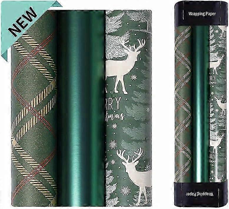 Christmas Gift Wrapping Paper - 3 Rolls Holiday Wrap Paper with Green Red Plaid, Reindeer and Metallic Foil for Gift Packaging -17 * 120 in/Roll - Vin