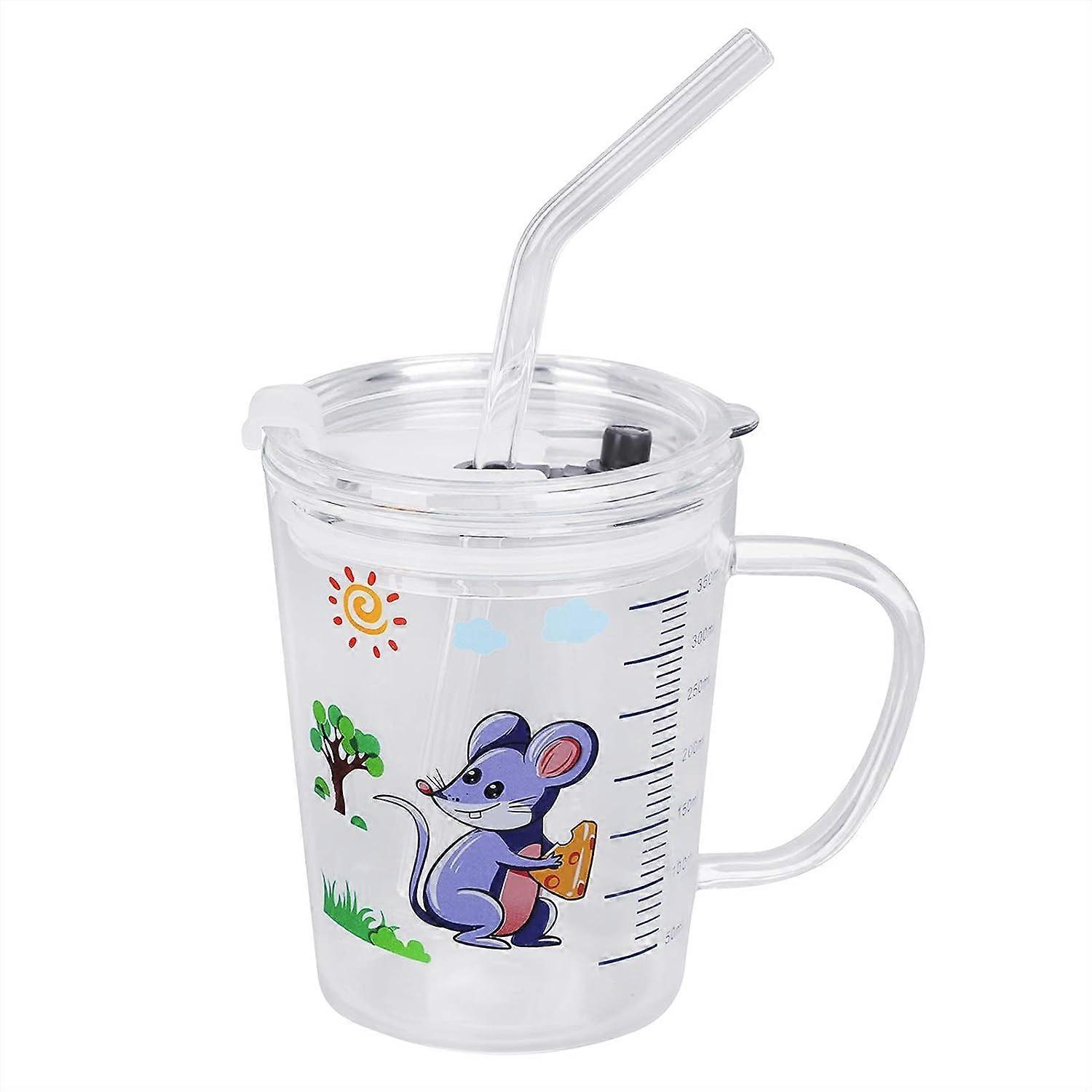 Lovely Kids Glass Cup With Straw Clear Scaled Milk Cup With Measuring 350ml Cup With Lid & Handle Microwave Leakproof Juice Mug Cartoon Water Drinking