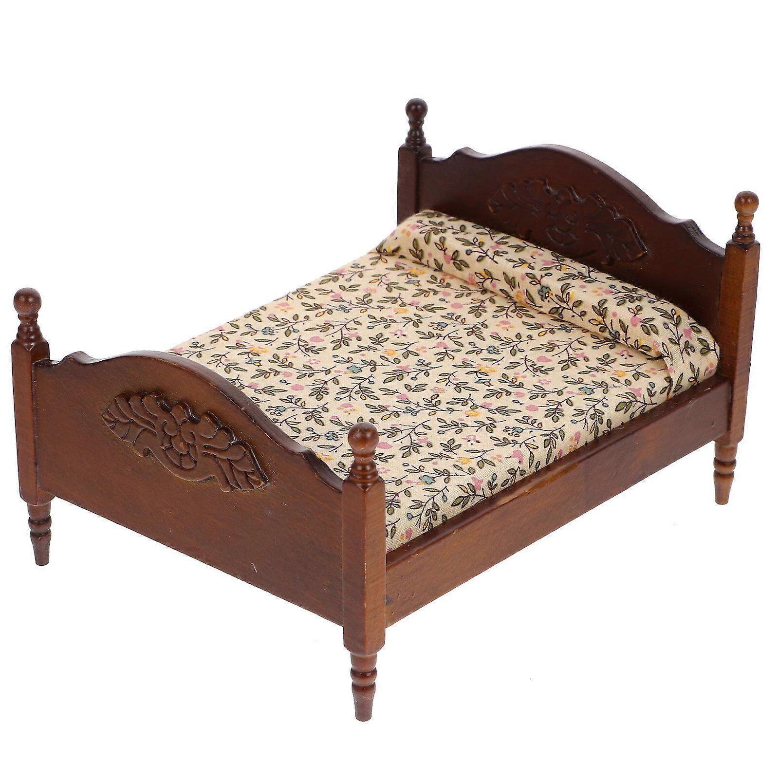 Mini House Miniature Bedroom Double-Bed Miniature Wood Bed Mini Adornment