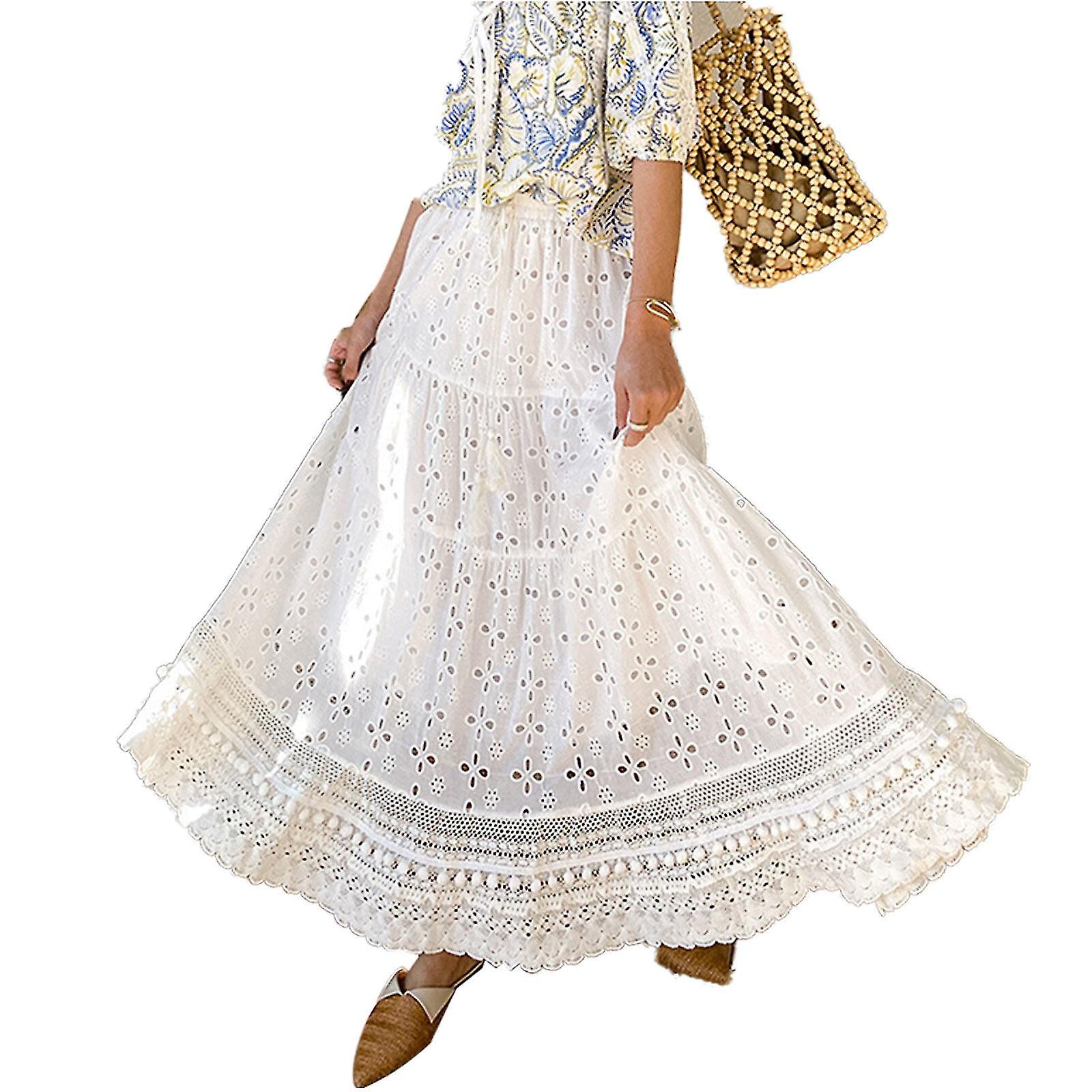 Women's Bohemian Pleated Lace Flower Maxi Skirt Hollow Polyester Half-length Skirt