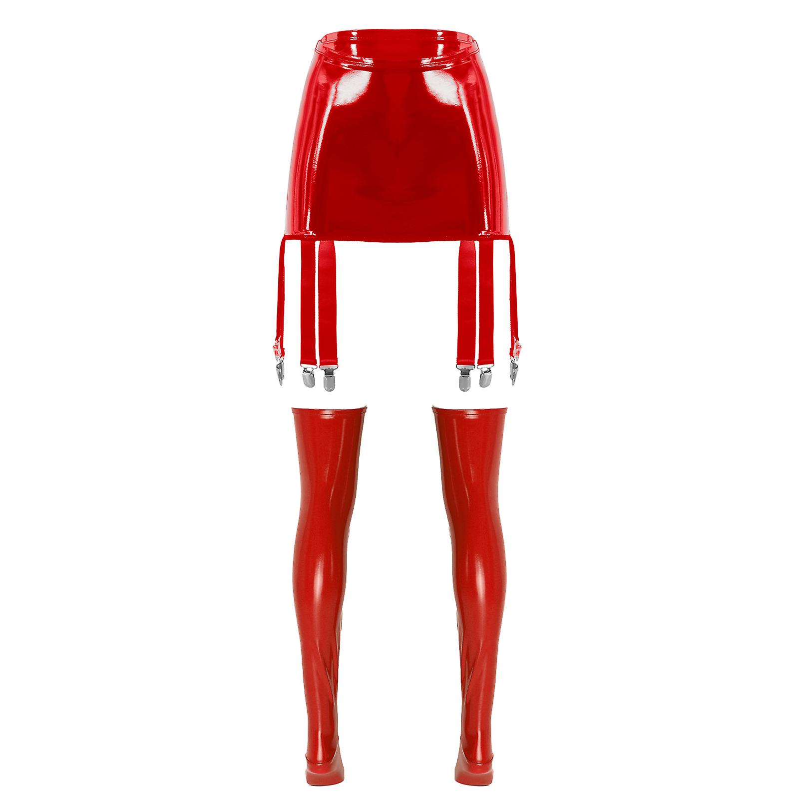 Womens Cosplay Clubwear Patent Leather Flared Skirt Glossy Invisible Zipper A-Line Mini Skirts with Thigh High Stockings