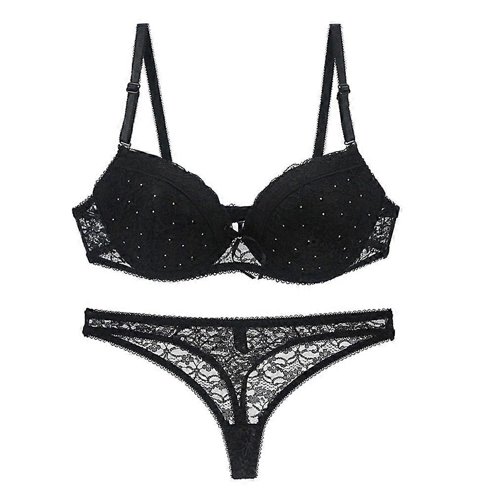 Women Lingerie Strappy Sexy Lace Bra Set See-through Lingerie Underwear Panties 85B (Black)