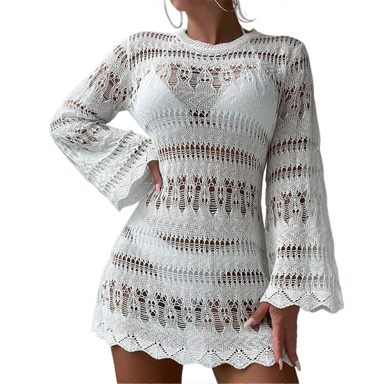 Women Swimsuit Coverup Dress Hollow Out Beach Coverup Long Sleeve Crochet Beach Dress for Swim Pool Beach Parties White