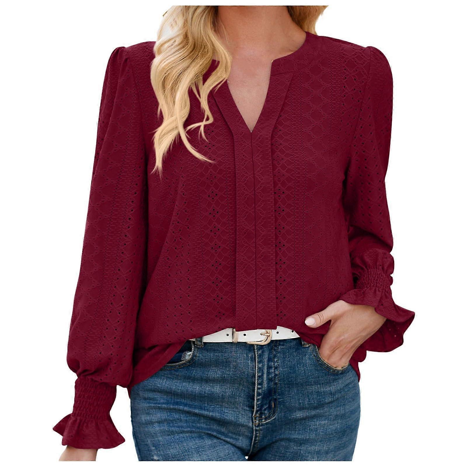 Women's Hollow-out Lace Puff Sleeve Long-Sleeve Top, Casual Shirt, Ruffled Puff Sleeve Long-Sleeve Autumn Top Claret XL