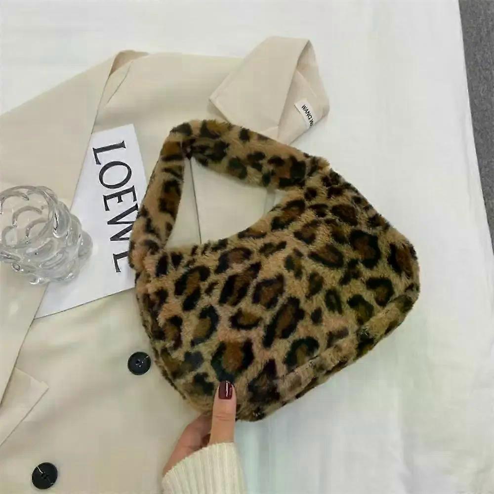 Women's Soft Plush Shoulder Bag Winter Fashion Casual Solid Color Leopard Pattern Underarm Bag Female Handbags Tote Bag