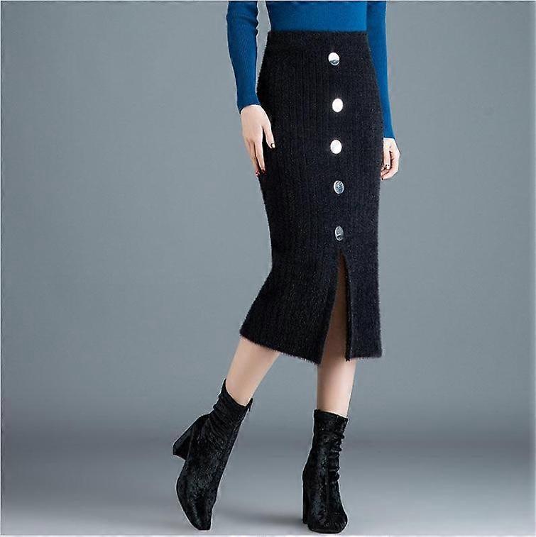 Autumn Winter Women's Temperament Breasted Midi Knitted Skirt Female Skirt High Waist Thicken Pockets Slim One Step Hip Skirt
