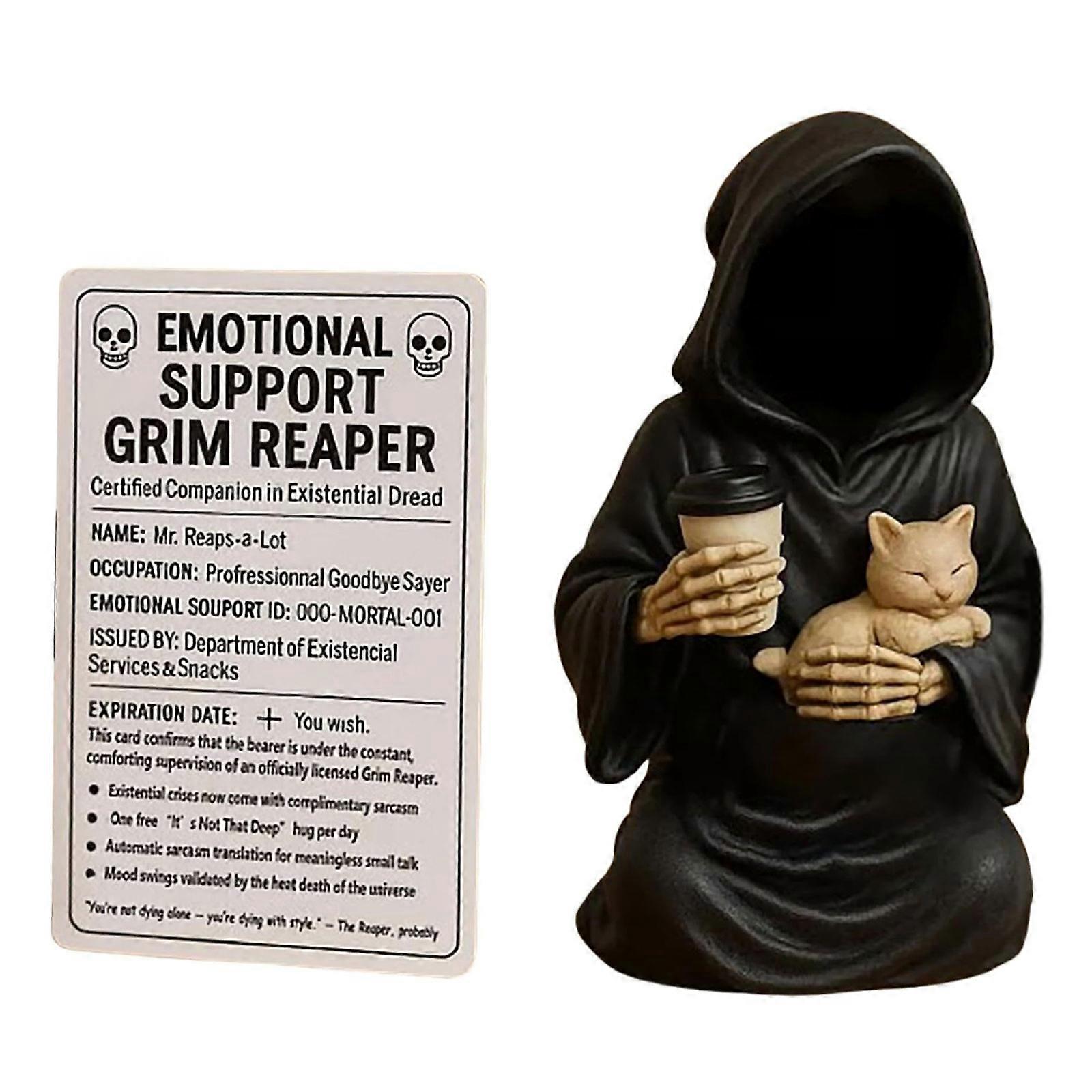 Unconventional Comfort Sculpture For Cats Owners Gothic Decors Resins Death Figurine Collectibles With Coffee Cup Multicolor