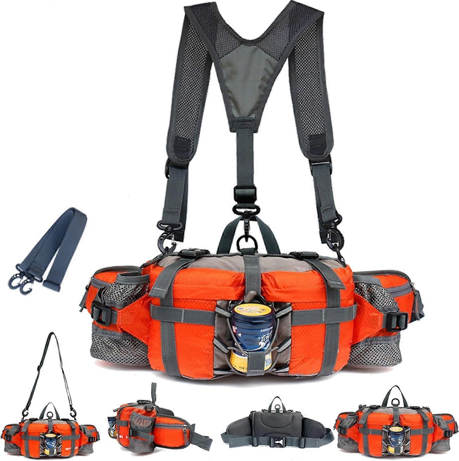 Ultralight Multifunctional Outdoor Waist Bag: Whether you are hiking, cycling, camping or walking, this waist bag can hold all your essentials. This bag has multiple pockets to keep your items organized and easy to access. This waist bag is 11 * 4.3 * 6 inches (L*W*H), the waist belt can be adjusted from 23 to 50 inches to ensure a comfortable fit for various body shapes, and the uniquely designed shoulder strap can reduce the pressure on the waist. It also comes with a long and fully adjustable shoulder strap, which can be used as a shoulder bag.Lightweight Multi-Pocket Design: Outdoor lightweight and practical waist bag, can carry enough water and equipment, perfect for mobile phones, keys, wallets, fitness gear, money. The double water bottle holder can accommodate water bottles with a diameter of 2.9 inches, two external front zipper pockets, two external side zipper pockets, which can keep your items separated and neatly stored, suitable for one-day hiking, camping, cycling, fishing, etc.Made of high-quality waterproof fabric: The hiking waist bag is made of breathable and wear-resistant waterproof nylon fabric, which is anti-friction and wear-resistant, and can effectively protect your belongings from raindrops and sweat. Thickened bag walls ensure that valuable items such as cameras and mobile phones will not be damaged during hiking adventure trips.Safety Features: This tactical bag is equipped with reflective strips for increased visibility. Whether you are hiking at night or cycling in low-light conditions, the reflective details ensure that you stay visible and safe, making it a great choice for outdoor adventures.Fashionable Color OptionsThis versatile waist bag is available in a variety of bright colors, including crimson, cool black, purple, military green, etc., allowing you to show your personal style. Choose from bold camouflage or bright tones to find the perfect match for your outdoor gear Features:Size: 11.22 x 4.33 x 5.9 In(28.5 x 11 x 15 cm);waist strap can be adjusted from range 60 to 125 cm;water bottle holder can accommodate a 3" (about 25 oz) bottleWaist fit: 24 x 50 In60 - 125cmBelt size:16.92 x 36.61 In43 - 93cm, width 3.8cmShoulder strap size: 27.55 x 51.96 In70 - 132cm, width 1.5 In3.8cmHigh-quality breathable mesh lumbar padding makes you comfort against your waist, 2 extra shoulders straps, 3 ways to carry (hip back style, using the shoulder strap, using the backpack straps).Specification:Material:nylonWeight: 1.2 lbColor: A: Black; B: Green; C: Deep green; D: Orange; E: purple; F: red; G: Deep Red; H: Dark blue; I: blue; G: CamouflagePackage Includes:- 1 x waist pack- 1 x shoulder strap- 1 x backpack strapNote:1.Please allow 1-2cm differs due to manual measurement.2.Due to the different display and different light, the picture may not show the actual color of the item. Thanks for your understanding.