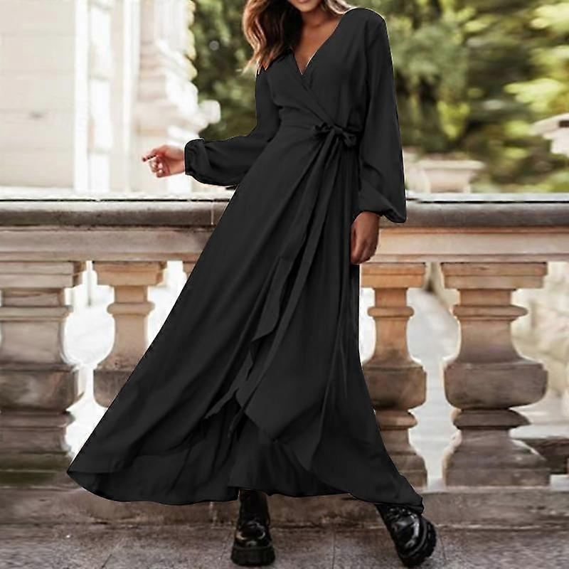 VONDA Women Fashion Solid Color V-Neck Long Sleeve Slit Dresses